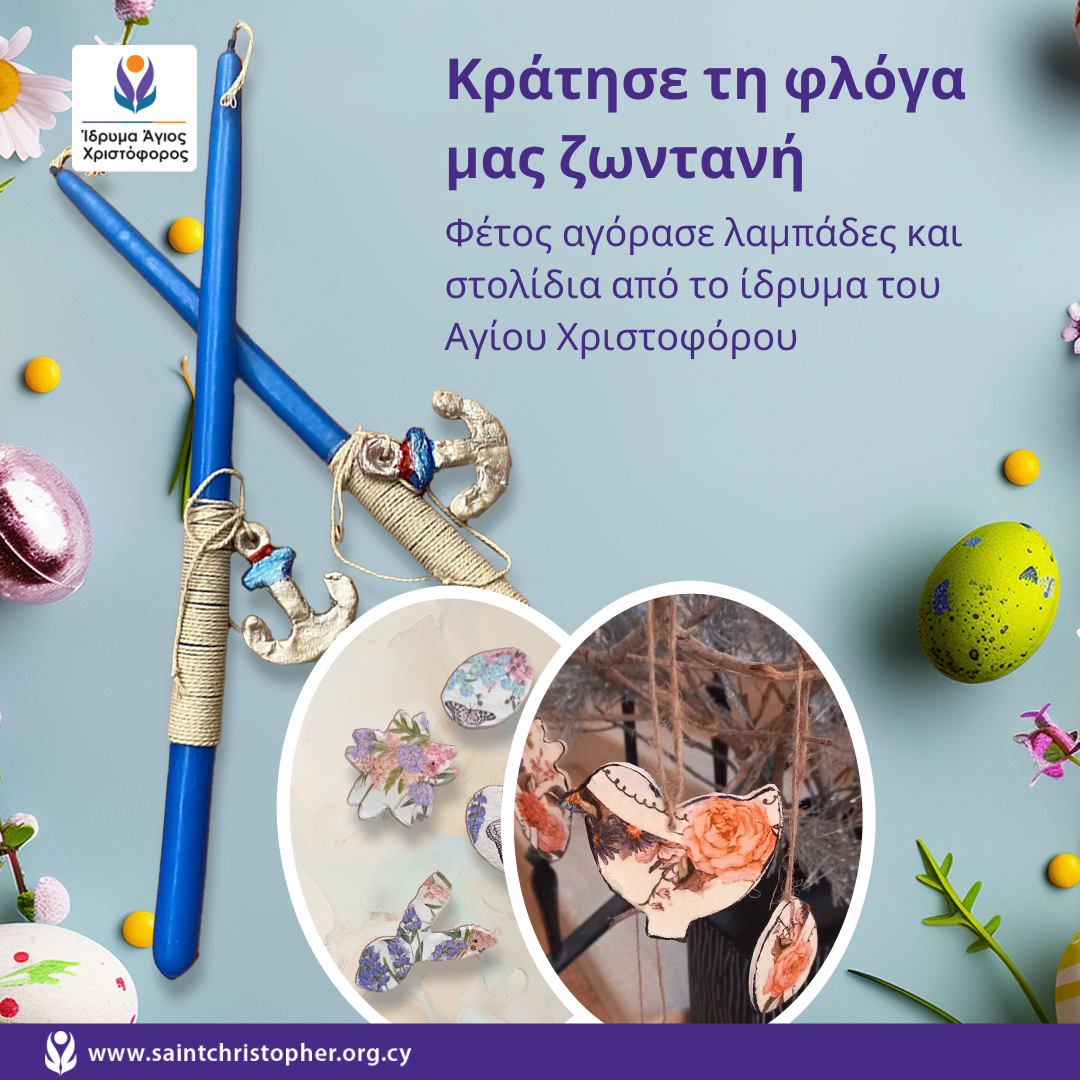 Αυτό το Πάσχα, σας προσκαλούμε να φωτίσετε τη ζωή κάποιου με τις όμορφες πασχαλινές λαμπάδες που πωλούμε. Κάθε λαμπάδα είναι φτιαγμένη με αγάπη από τα μέλη μας, και κάθε αγορά σας μας βοηθά να συνεχίσουμε το ζωτικό μας έργο. Με τον Άγιο Χριστόφορο, μπορείτε να κάνετε μια διαφορά και να φέρετε χαρά σε όσους την χρειάζονται περισσότερο. Σας ευχαριστούμε για την υποστήριξή σας.